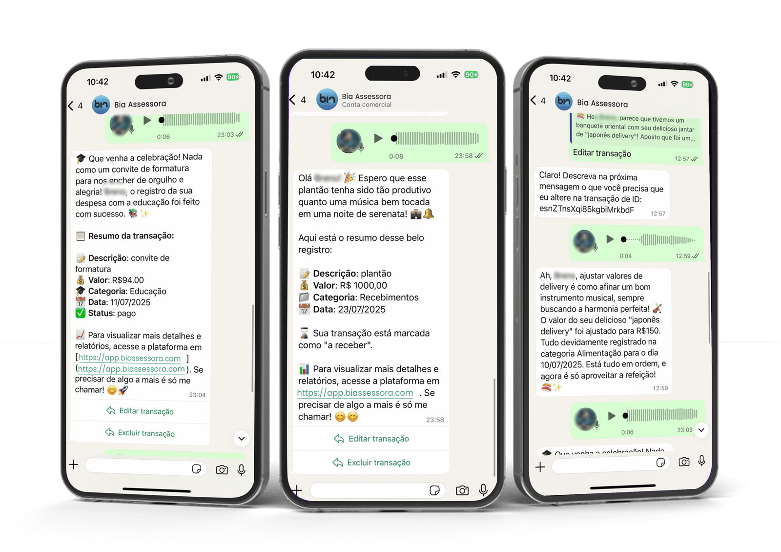 Registre receitas, despesas e compromissos diretamente pelo WhatsApp. Basta enviar uma mensagem para nossa assistente virtual e ela lançará automaticamente em sua conta.